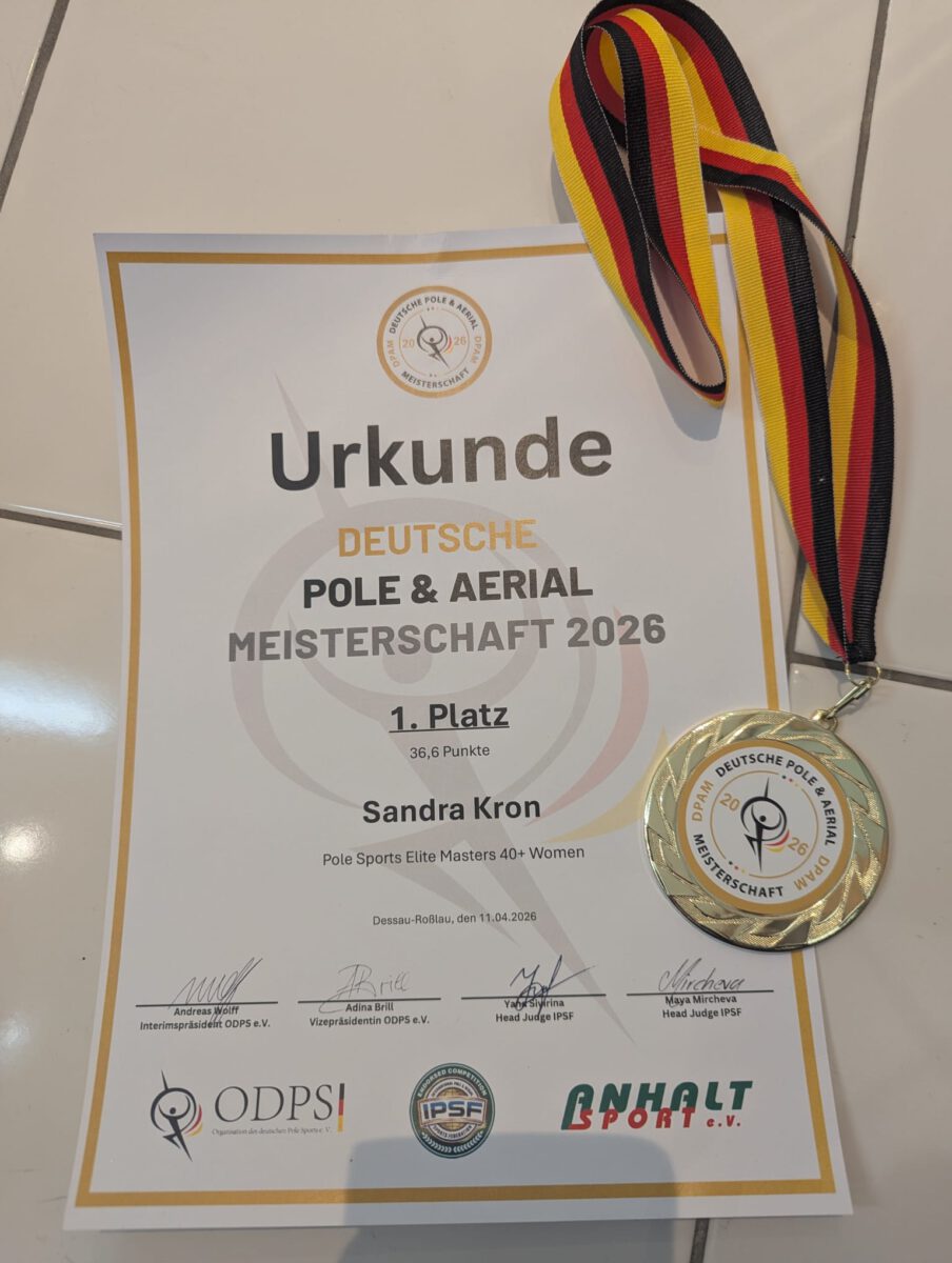 Die Simmertalerin Sandra Korn, geb. Jung, Tochter von Angelika und Ewald Jung, wurde im April Deutsche Meisterin im Pole und Aerial der Ü 40. Mit einer atemberaubenden Kür setzte sie sich gegen ihre Mitkonkurrentinnen durch und holte sich verdient den Titel. Der VfL gratuliert Sandra recht herzlich zu ihrem großen Erfolg.